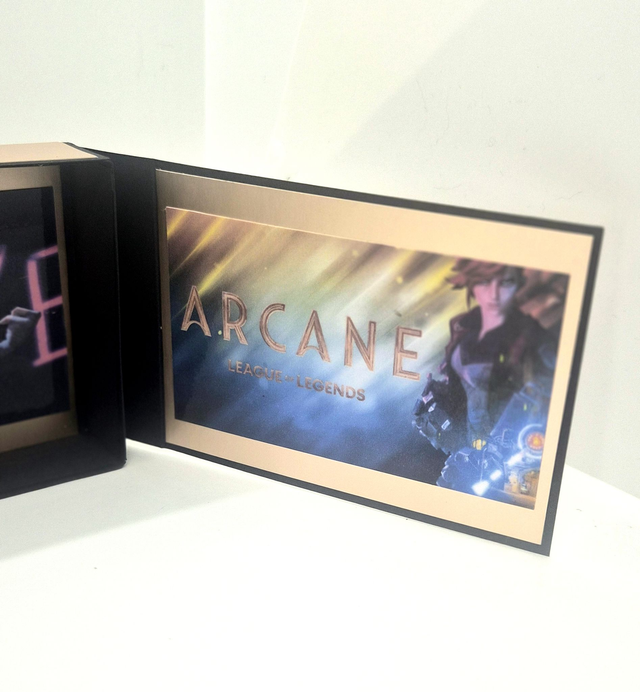 Boite à crayon réalisée à la main avec du carton épais à l'effigie de "Arcane"