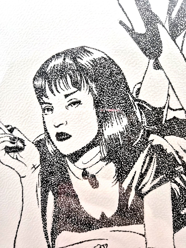 Le dessin est réalisé à la main aux feutres avec la technique du pointillisme.
